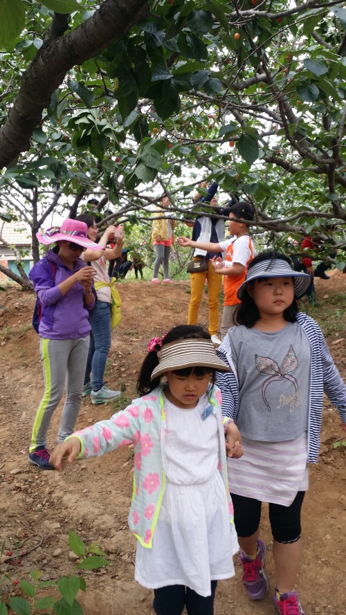 이날 오후 신사모 회원 50여명은 완커부동산에서 제공한 버스를 타고 칭다오에서 유명한 앵두동네인 둥거좡(东戈庄)에 도착, 산을 타고 아츠랗게 뻗어진 앵두나무사이를 오가며 빨갛게 익은 앵두를 따먹는 체험을 했다. 요즘 앵두는 신선하고 맛이 아주 달아 제법 입맛을 돋구었다. 어른이나 애들이나 할것없이 앵두 따먹기에 시간이 가는줄 몰랐다.