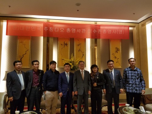 주칭다오 대한민국총영사관 이수존 총영사가 13일 오후 웨이하이조선족기업협회(회장 전양준)를 방문하고 회장단 일행들과 간담회를 진행하였다.