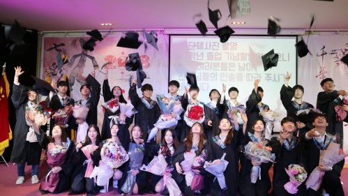 사진설명: 22명의 졸업생들이 무대위에서 축하세러머니를 하고 있다.