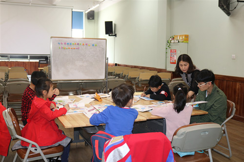 한글학교는 매주 토요일 오후 1시부터 2시까지 강의한다. 이날 첫번째로 수업에 참가한 학생은 5~11세 어린이 6명으로 이중에는 여성협회 회원 자녀와 칭다오 거주 기타 조선족 어린이들이 포함되어 있다.